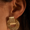 Deze gestructureerde cirkeloorbellen combineren een vleugje retro met een eigentijdse vormgeving. Het ontwerp bestaat uit een stevige ronde vorm met een uitgesproken ribbelstructuur, wat zorgt voor diepte en visuele kracht. De centrale cirkel wordt doorkruist door meerdere verticale lijnen die het geheel versterken en een gelaagd effect creëren.