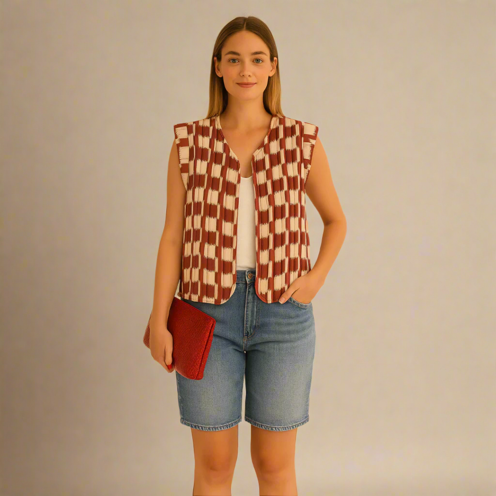Dit stijlvolle mouwloze gilet combineert een moderne geometrische Afdruk met een hip, minimalistisch ontwerp. De gestructureerde stof en het open ontwerp maken het perfecte voor laagjes uitstraling, terwijl de opvallende afdruk zorgt voor een unieke uitstraling.