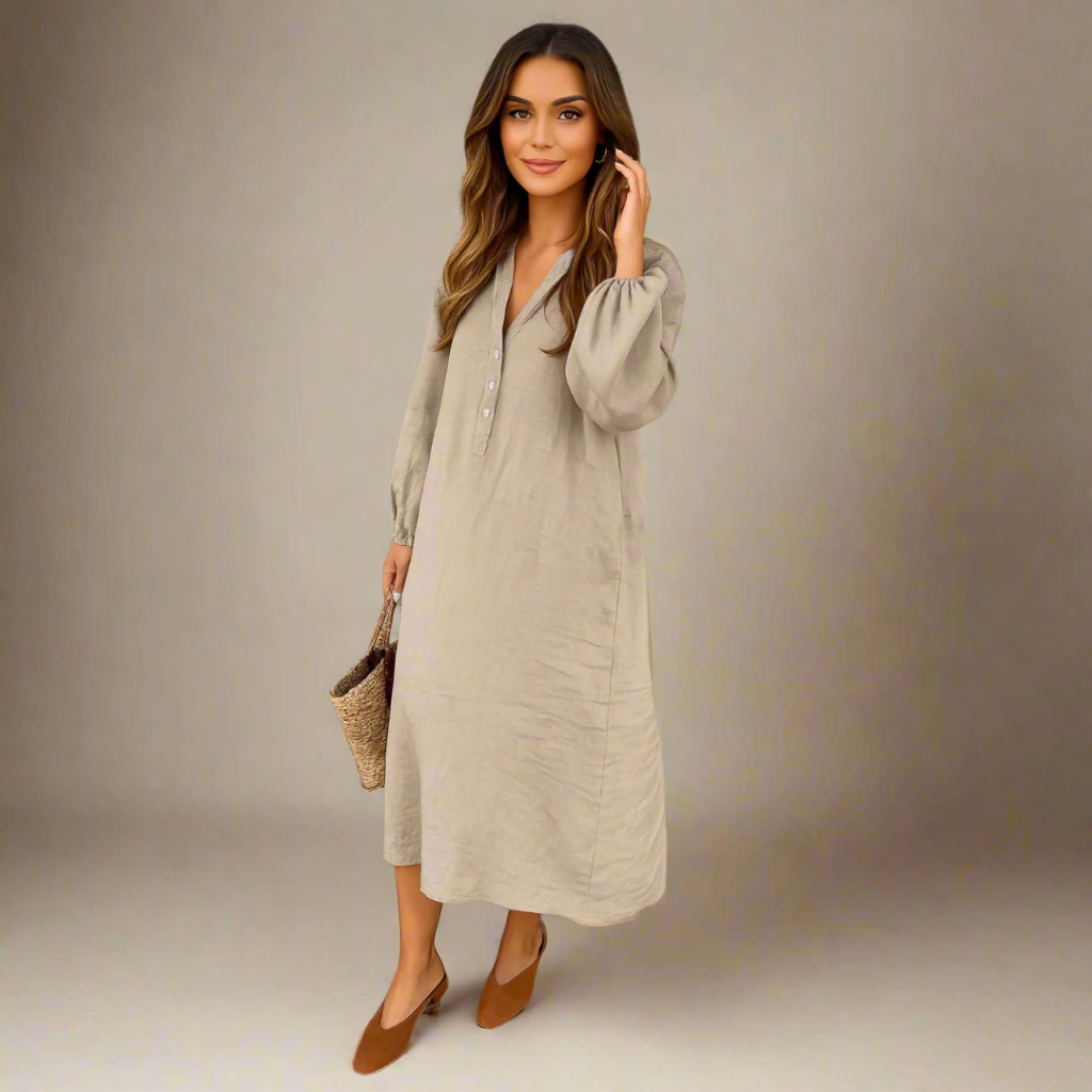 Ontdek onze luchtige zomerjurk met knoopdetails en lange, lange mouwen die een verfijnde en ongedwongen uitstraling geven. De neutrale kleur maakt het een veelzijdig stuk dat gemakkelijk te combineren is met verschillende accessoires.