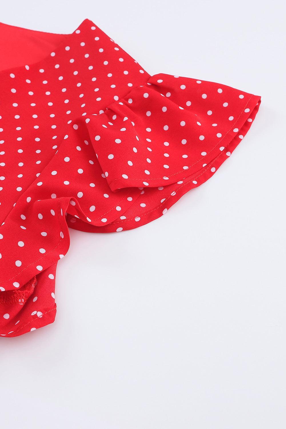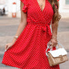 Deze charmante jurk met stippen en striksluiting straalt een speelse elegantie uit die perfect is voor zonnige dagen en ongedwongen gelegenheden. De jurk is voorzien van een flatterende V-hals die zorgt voor een vrouwelijk silhouet, terwijl de ruches op de mouwen een romantisch accent toevoegen. De taille wordt geaccentueerd door een strikceintuur die je naar wens kunt aanpassen om je figuur te benadrukken. De licht uitlopende rok biedt een luchtige en comfortabele pasvorm, ideaal voor warme dagen of lange zomerse avonden. De vrolijke stippenprint zorgt voor een tijdloze uitstraling die moeiteloos gecombineerd kan worden met verschillende accessoires.