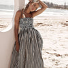 Het streepdessin in verticale richting verlengt visueel het silhouet en creëert een slank en gestroomlijnd effect. De subtiele, regelmatige strepen geven de jurk een moderne, doch tijdloze uitstraling die nooit uit de mode raakt. De dunne schouderbandjes zorgen voor een luchtig gevoel en laten de schouders mooi uitkomen, ideaal voor warme dagen op het strand of tijdens een zomerse stadswandeling. De rok valt losjes en zwierig vanaf de taille, wat zorgt voor extra bewegingsvrijheid en comfortabele.