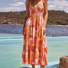 Laat je omhullen door de warmte van een tropische avond met deze gelaagde jurk, geïnspireerd op de kleurenpracht van een zonsondergang. De bloemenprint bestaat uit rijke tonen van oranje, zachtroze, perzik en goudgeel, wat deze jurk direct een zomerse en levendige uitstraling geeft. De brede bandjes met strikdetails zorgen voor een charmant accent en extra comfort, terwijl het gesmokte lijfje zich perfect vormt naar het bovenlichaam. Dit zorgt voor een flatterende pasvorm en benadrukt subtiel de taille.