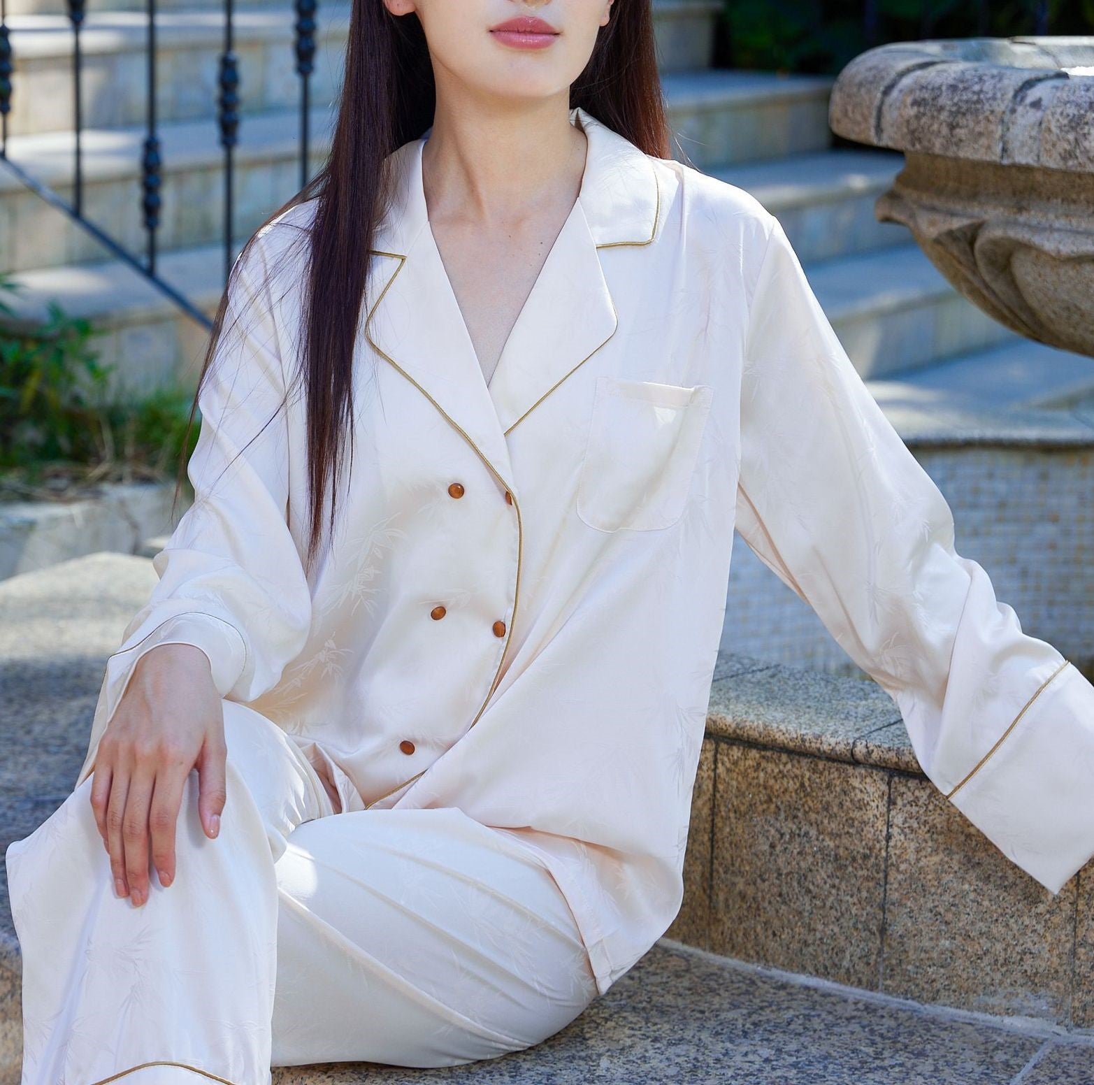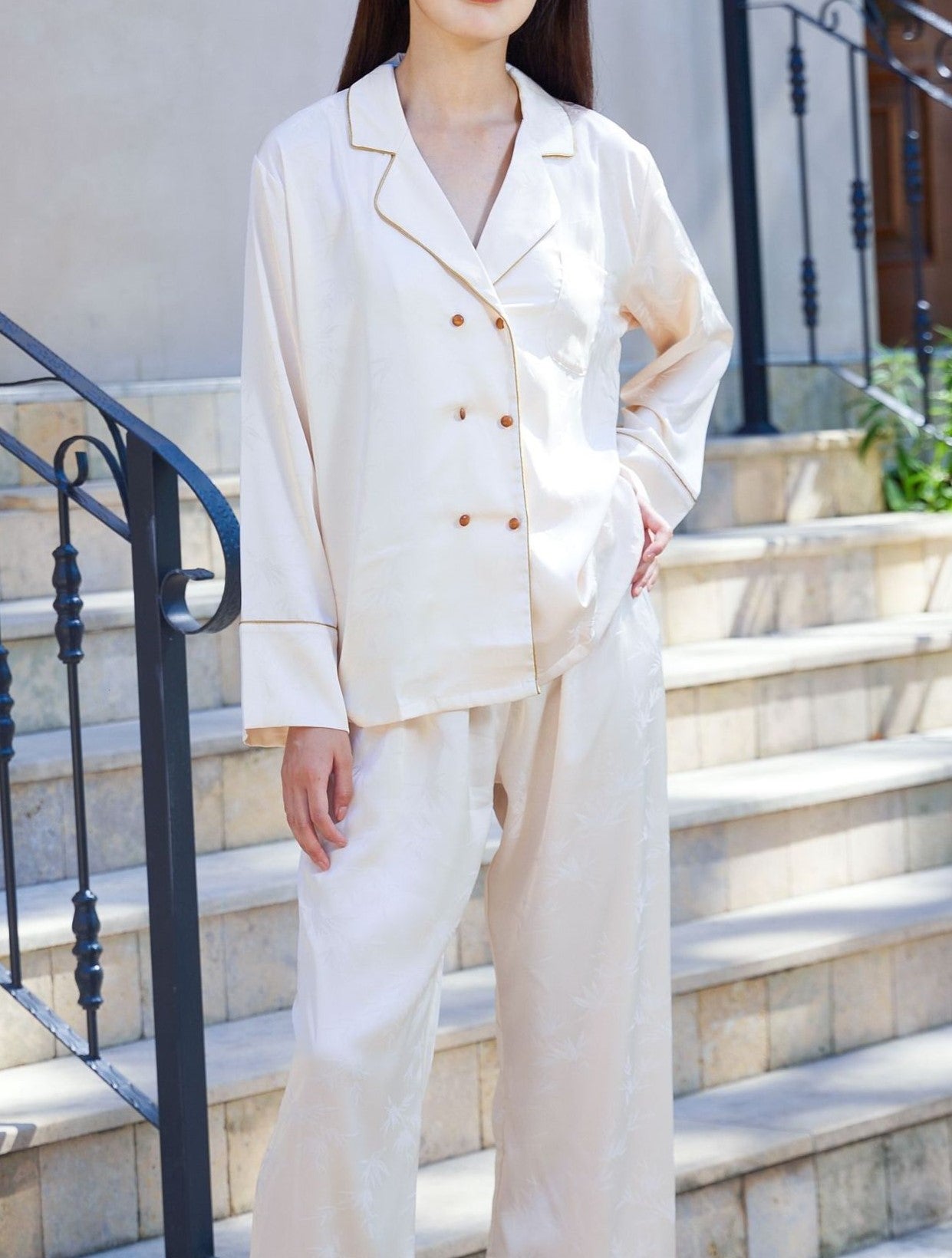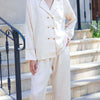 Deze chique set straalt moeiteloze elegantie uit. Het losvallende silhouet en de subtiele patronen geven een verfijnde en stijlvolle uitstraling. De dubbele knoopsluiting en de vloeiende pasvorm maken deze set zowel comfortabel als stijlvol, ideaal voor divers gelegenheden.