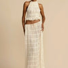 Deze halternek geruffelde twee-delige set combineert speelse elegantie met een moderne uitstraling. De verfijnde ruches en luchtige pasvorm creëren een lichte, moeiteloze uitstraling die perfecte is voor zonnige dagen en bijzondere gelegenheden. De haltertop benadrukt de schouders op een stijlvolle manier, terwijl de wijde broek zorgt voor een vloeiend en sierlijk silhouet.