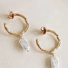 Deze unieke oorringen combineren natuurlijke vormen met een tijdloze uitstraling. Het ontwerp valt direct op door de onregelmatige, golvende structuur van de hoepel, die doet denken aan een met zorg gevormd design. De zachte glans van het metaal contrasteert subtiel met het bijzondere detail — een onregelmatig gevormd hangend element dat elke oorbel een eigen karakter geeft.