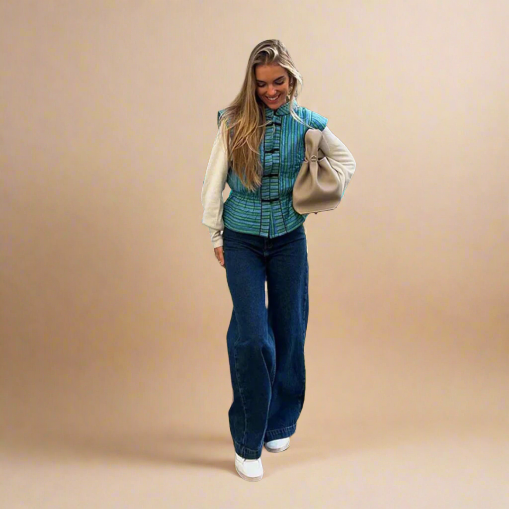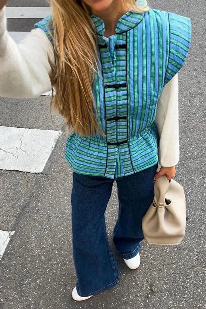 Deze chique mouwloze top combineert een klassiek gestreept patroon met elegante knoopdetails voor een verfijnde maar eigentijdse uitstraling. De hoge halslijn en getailleerde taille creëren een flatterend silhouet, terwijl de delicate plooien textuur en charme toevoegen. Perfect voor zowel ongedwongen als semi-formele gelegenheden, voegt dit item een vleugje elegantie toe aan je garderobe.